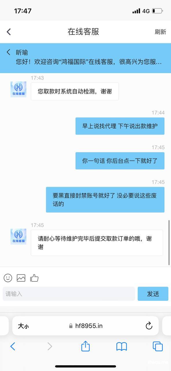 鸿福国际 网址https://m.hf8955.in 300块钱出不起 一直说系统维护 真他妈的黑b台 比少妇的b 还黑 希望大家避雷 萝卜服务器xycp999 加狗带cy147258 这些人真的是畜生来的 他妈的逼 玩欧洲杯 波胆 独赢都黑 谁去玩谁死 这种畜生